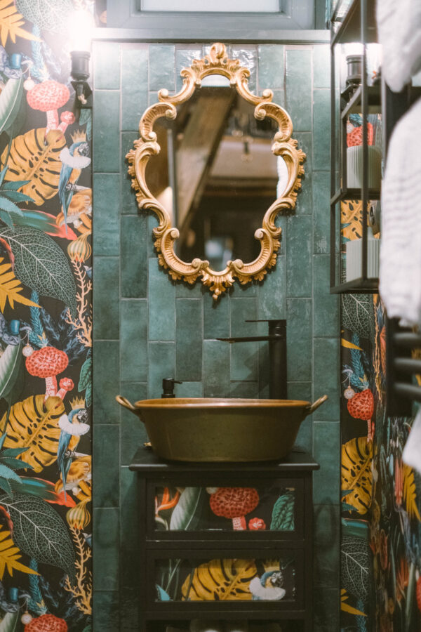 A vendégház ékessége a fürdőszoba, melyet szintén a környezethez idomulva álmodtunk meg, így a madár – és növényvilág lenyűgöző mintáit vonultatja fel.
